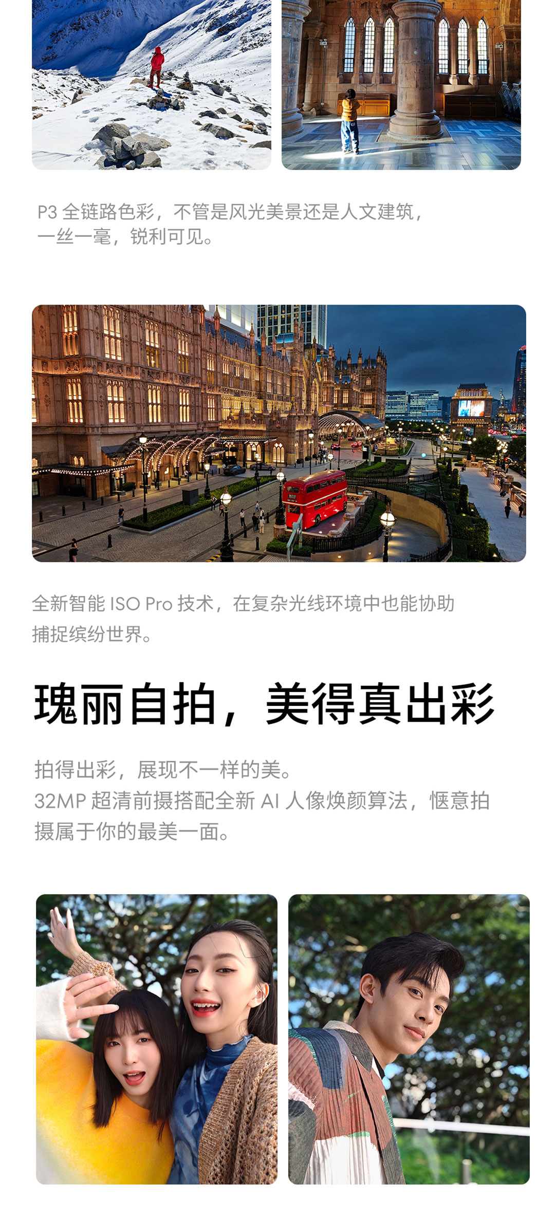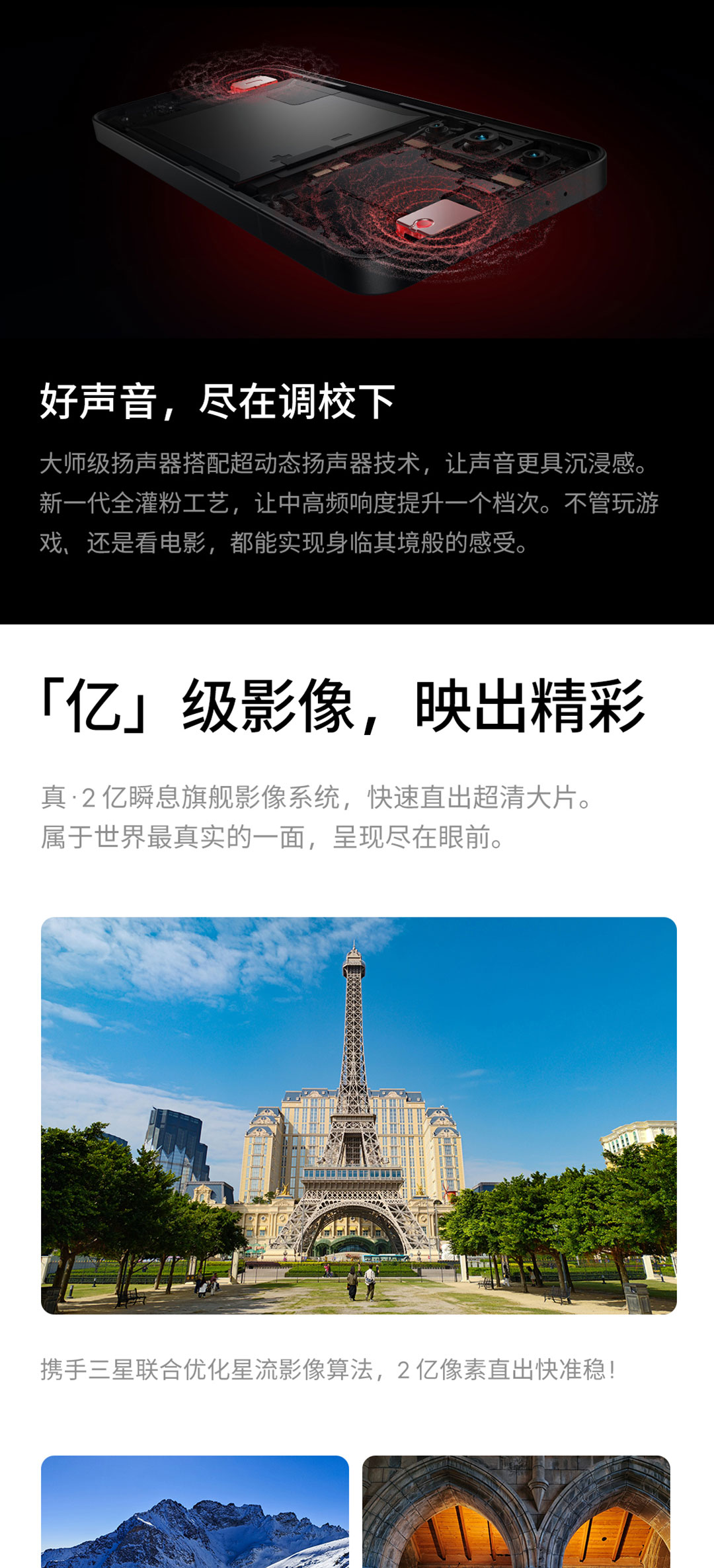 主摄/广角:2 亿像素+ƒ/1.7+等效焦距 22MM+7片式镜头 超广角/微距:1300 万像素+ƒ/2.4+等效焦距 15mm+5 片式镜头 景深:500 万像素+ƒ/2.4+等效焦距 27mm+3 片式镜头 |