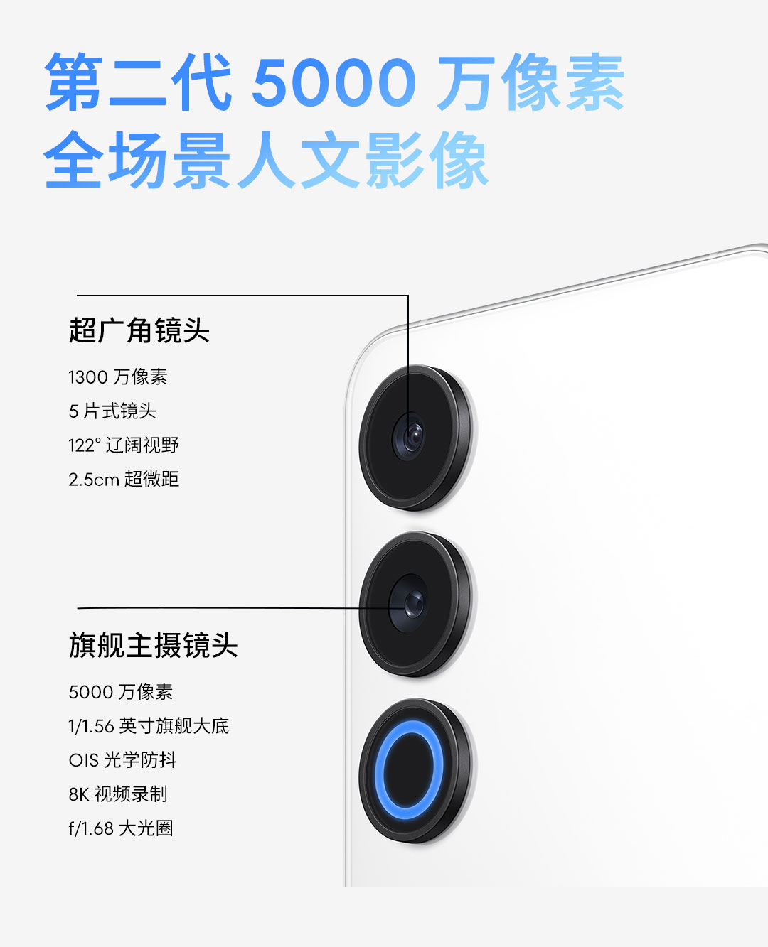 超广角/微距:1300 万像素+ƒ/2.4+等效焦距 15mm+5 片式镜头 主摄/广角:5000 万像素+ƒ/1.68+等效焦距 24MM+6片式镜头 |