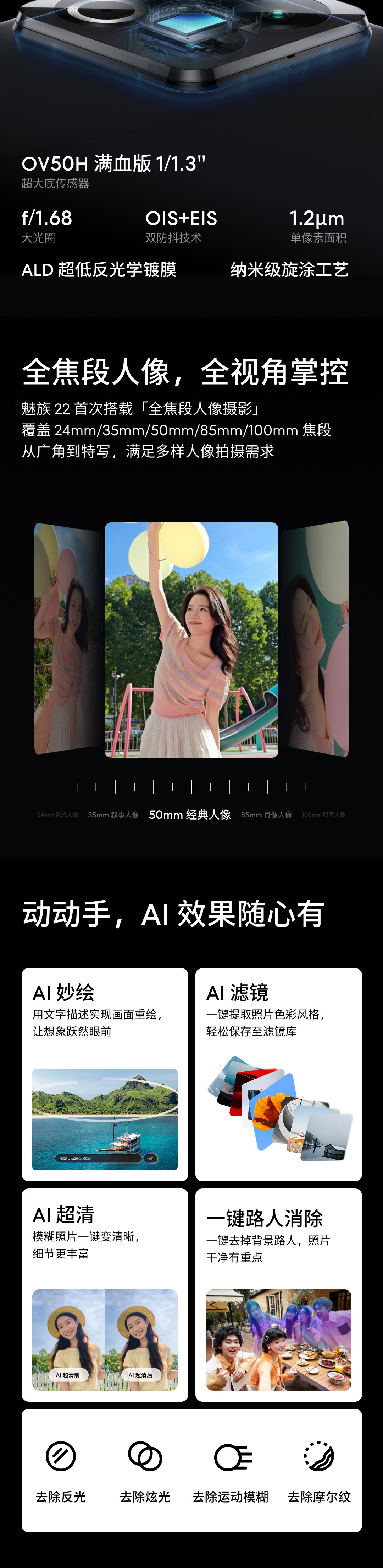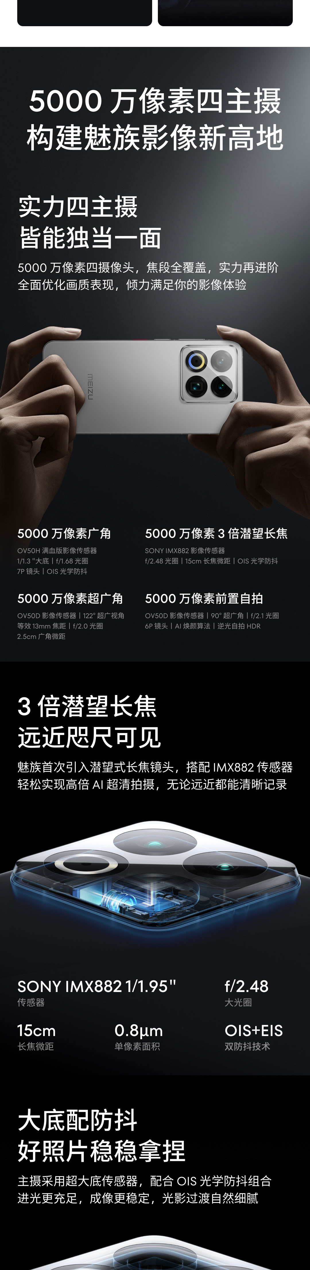 主摄 50M OIS + 超广角 50M + 潜望长焦 3X 50M OIS 超广角:5000万像素 + ƒ/2.05 + 等效焦距 13mm + 6 片式镜头 长焦:5000万像素 + ƒ/2.48 + 等效焦距 72mm + 4 片式镜头 |